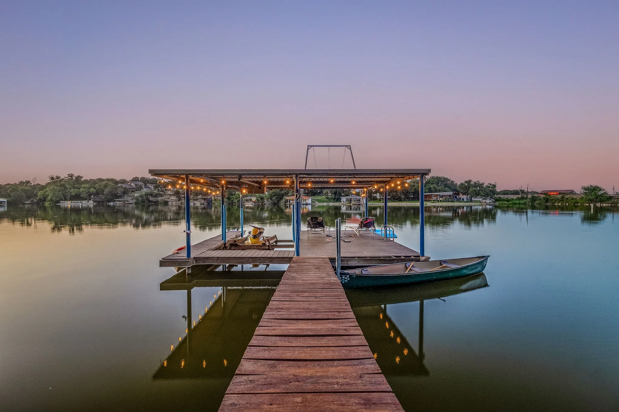 Welcome to your lakefront retreat! This beautifully renovated A frame home featured in 360 West Magazine, is nestled in a serene private cove on Lake Granbury. Owned by the same family for 44 years, this cherished getaway has been the backdrop for generations of unforgettable memories. Now thoughtfully updated with meticulous attention to detail, the home blends modern luxury with timeless charm. With 4 bedrooms and 3 bathrooms, it comfortably sleeps 10. Enjoy quartz countertops, stainless steel appliances, engineered wood flooring, shiplap walls, and custom window treatments throughout. A spiral staircase leads to a cozy loft featuring a 4bed bunk room and an inviting reading nook. Soft whites, soothing grays, and warm natural textures create an elegant, relaxing interior. Surrounded by mature oak and elm trees, the lush St. Augustine lawn leads to the water’s edge just 25 feet from the home. Beautiful lakeside deck offers the perfect space for entertaining, while the covered boat dock with lift makes lake access easy.Whether you're looking for a personal getaway or a proven investment, this home delivers, it’s an active Airbnb with a 5 star Guest Favorite rating cherished by many! With an average nightly rate of $400. All indoor and outdoor furnishings are available for separate purchase, so you can move right in or start hosting immediately. Lake living at its finest. New Roof April 2025!